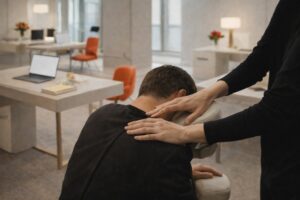 Massage sans huile en position assise sur une personne habillée. Ce soin détend toute la partie du dos grâce aux divers mouvements ciblés.