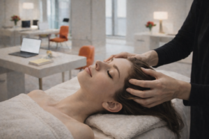 Massage du cuir chevelu et de la nuque permettant de stimuler la circulation sanguine, aider à relâcher les tensions. Ce soin procure une sensation de détente, soulageant le stress et les maux de tête.
