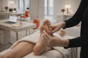 Massage des pieds à l’huile permettant de soulager le stress, favoriser un bon sommeil et de se détendre profondément.